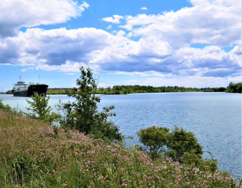 I keep this route simple by following the Welland Canals Parkway Trail on the west bank of the Welland Recreational Waterway the whole way. This means leaving the main Welland Ship Canal at Port Robinson. Let me explain. From 1967-72, a new 13.4 km section of the Fourth Canal was constructed, bypassing the City of Welland to the east and further straightening the course of the Canal. Most of the former Fourth Canal through the heart of Welland has been preserved as the Welland Recreational Waterway, and it’s now a major centre for Canadian watersports.
