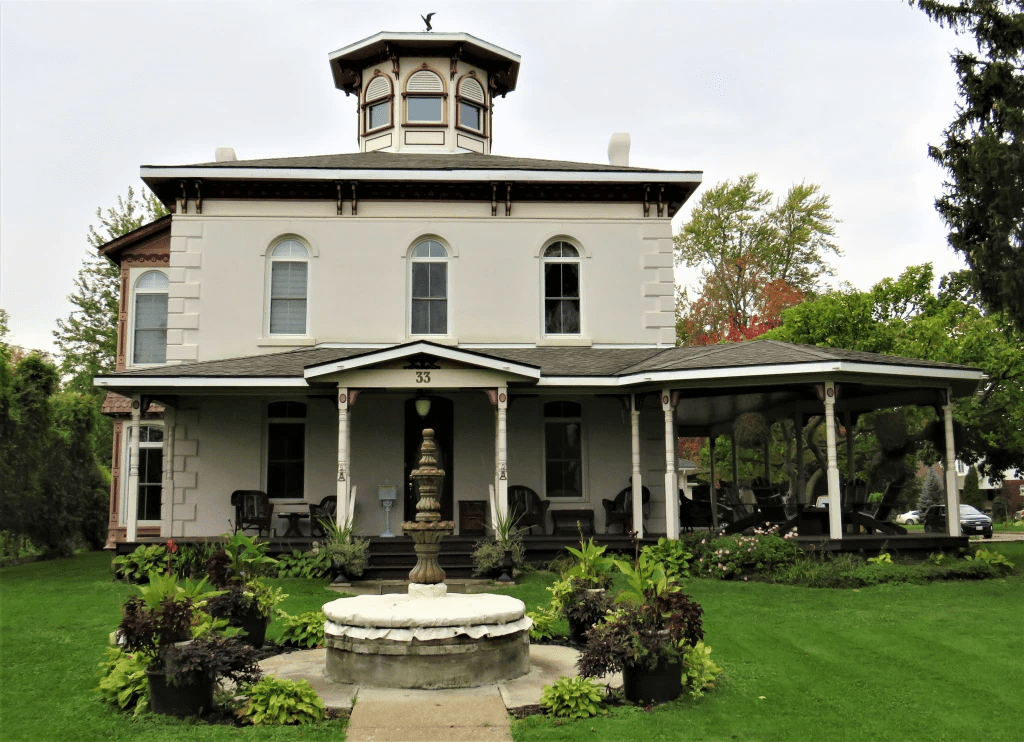 158. The Morwood House at 28 Young Street. Richard Morwood was the owner of a general goods store on West Main Street. His house was begun in the 1860s and enlarged over time. In 1913 it was turned into a duplex but remained with the Morwood family until 1943. It’s now a designated heritage property. (I only noticed the dogs in the windows long after I’d taken the photo.)