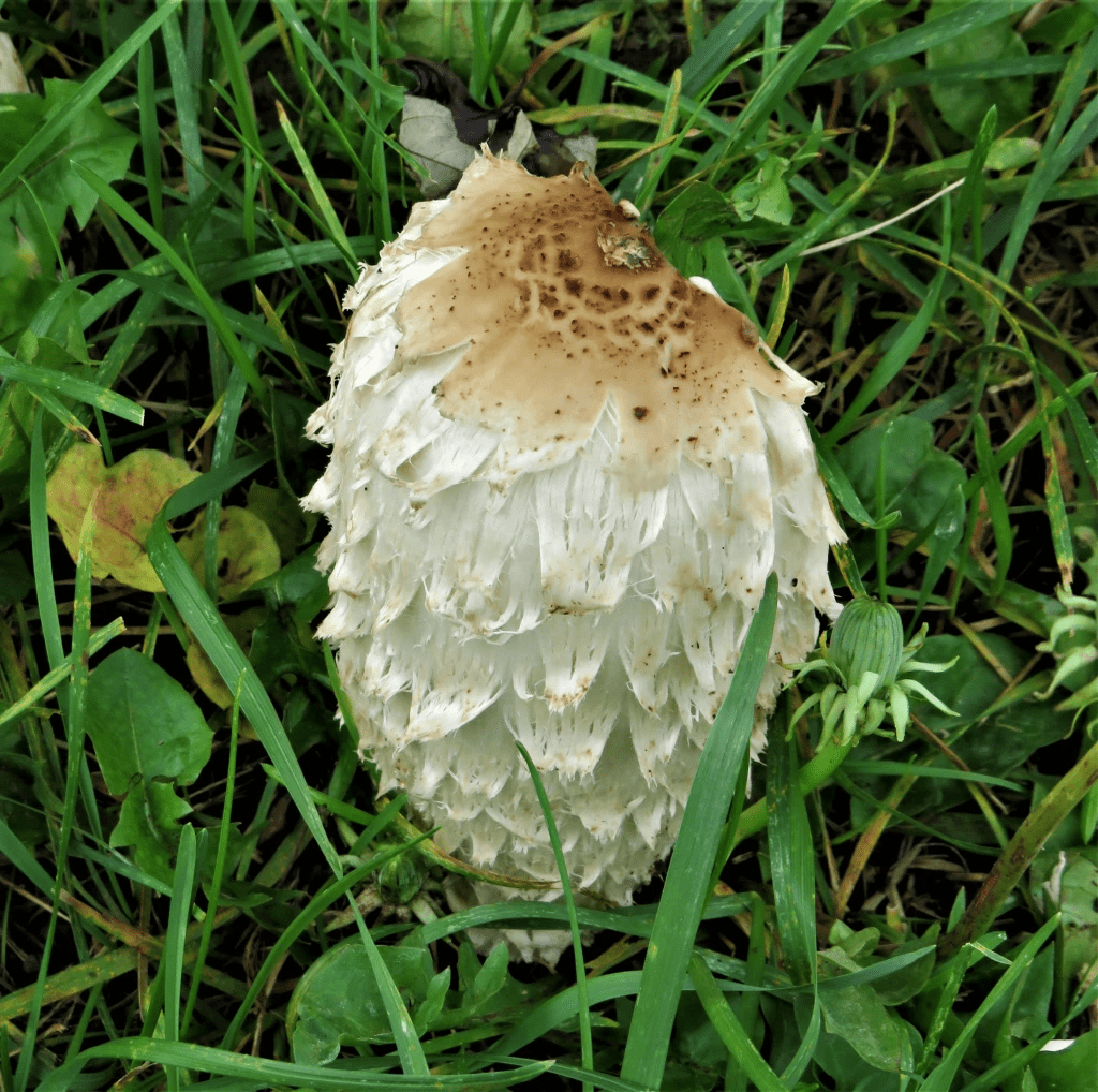 161. A shaggy mane mushroom (Coprinus comatus) on a lawn by the bank of the Canal.
