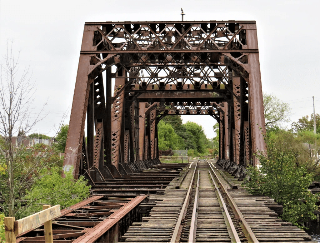 162. Bridge 15 (ca. 1910), a Baltimore Truss swing bridge at Crowland in south Welland, carried the former Canada Southern Railway over the Fourth Canal. The bridge is owned by Canadian Pacific but the single remaining track no longer connects to the CPR network, and has only sporadic industrial use.