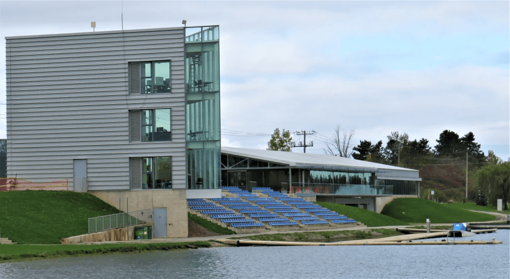 165. The Welland International Flatwater Centre lies at the dead end of this section of the Recreational Waterway, and marks the end of today’s hike. International regattas using courses up to six lanes wide and from 500 to 2,000 metres in length are held here on the North Course and there are 500 permanent seats for spectators plus room for thousands more on the surrounding banks. This facility even has an indoor paddle tank and rowing, canoe, kayak, and dragon boat training.