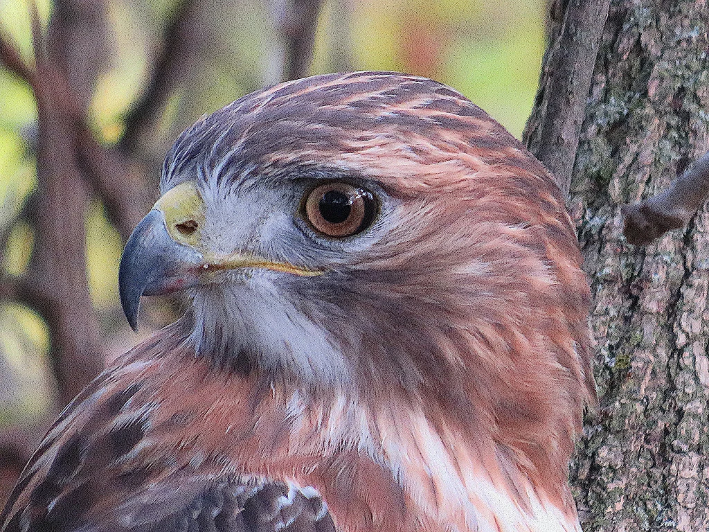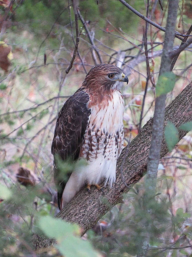 150. At this point there’s a strip of forest between the Trail and the Waterway. And there perched almost motionless on a low branch is this magnificent red-tailed hawk (Buteo jamaicensis).