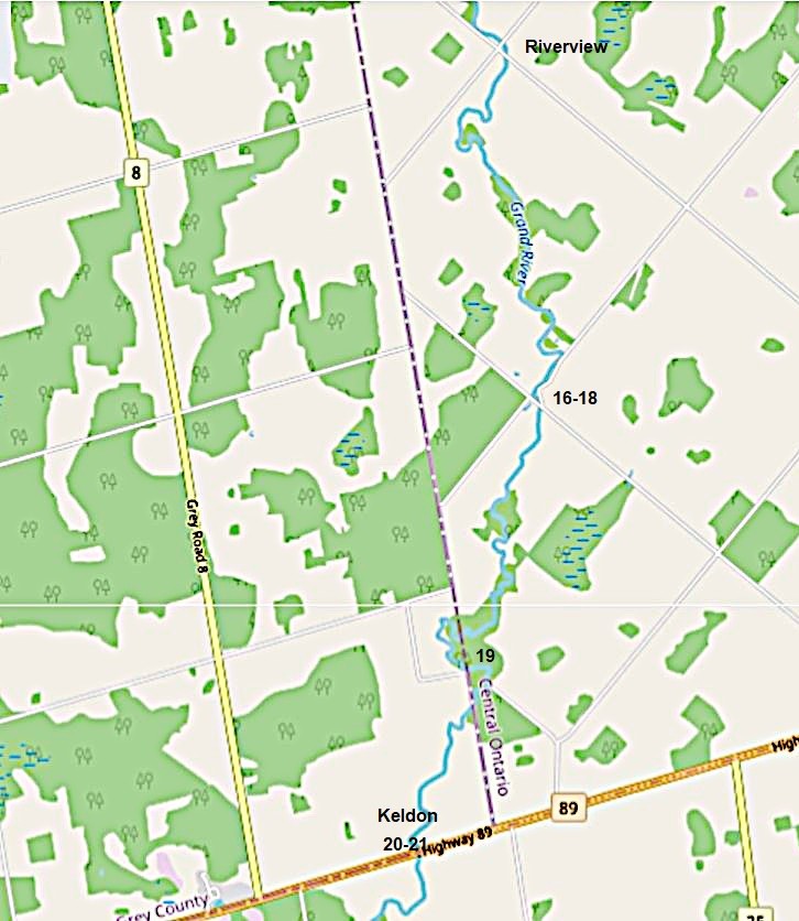 20. At last: the first roadside sign identifying the Grand, at Keldon on Ontario Highway 89. This is a paved east-west highway, important enough to be maintained by the province rather by the local municipality.