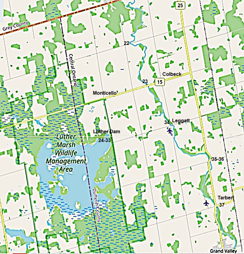 It’s about a 20 minute drive between Riverview and Grand Valley, but I won’t be going directly. I’ll be making a short detour via Luther Dam (near the northeast corner of Luther Marsh above). That’s because Luther Marsh, behind the dam, is the chief feeder of the Upper Grand, via Black Creek. And the Upper Grand as we know it has been shaped by its relationship with Luther Marsh.