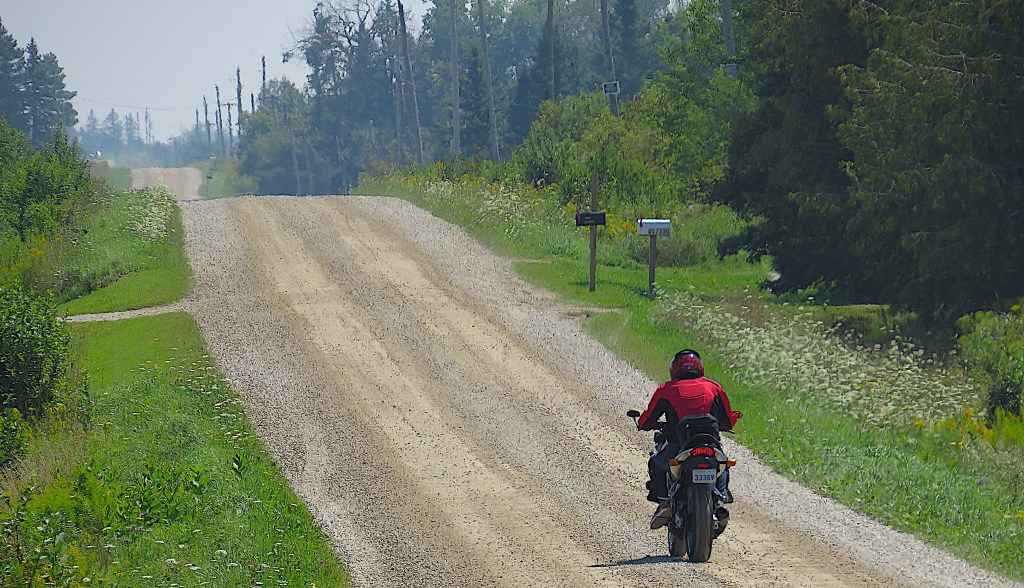 17. A biker opens up on 8th Line SW. Most roads hereabouts are gravel and lightly trafficked.