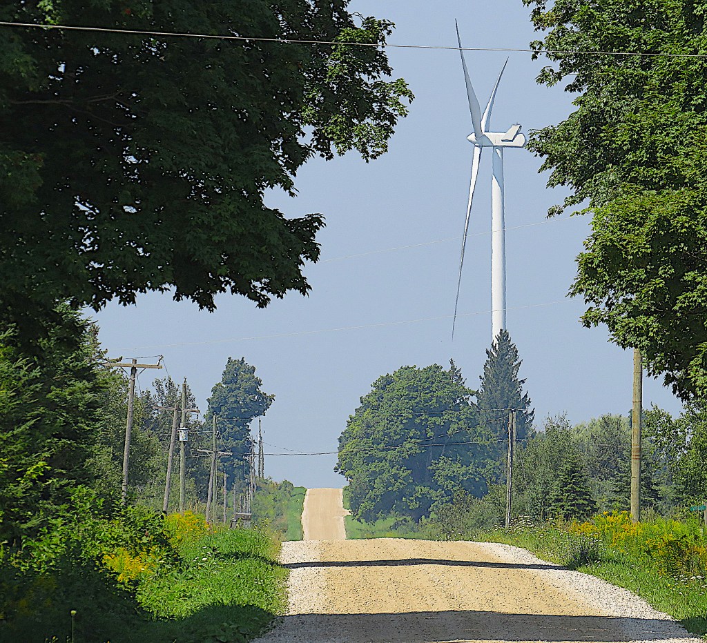18. A huge wind turbine looms on the crest of a rise above 8th Line SW close to its junction with the Southgate-Melancthon Townline.*