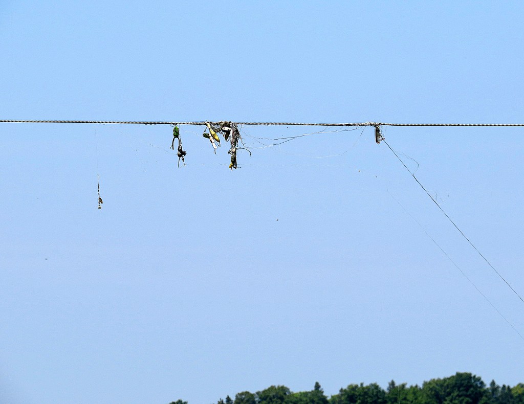 (Bottom) You can tell that this brief widening of the Grand is a fishing hole from the floats and tangled line caught in an overhead power line.