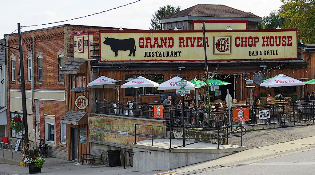 44. This eatery with its suspended patio is on the southwest corner of Main and Amaranth. This was the original location of Joyce’s Tavern, the log structure erected by a Mrs. Joyce and her sons and one of the first buildings in Joyce’s Corners, later Grand Valley.
