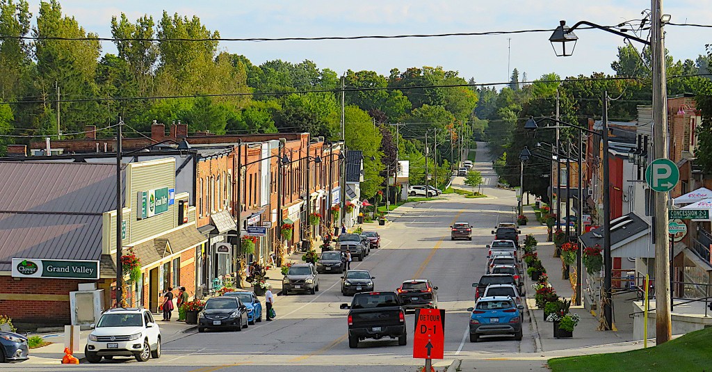 38. The centre of Grand Valley – the town, not the Town – from near the junction of Main Street and Amaranth Street looking south. Main Street dips picturesquely down to where it crosses the river whose name it shares, then slopes up again beyond. Grand Valley (current pop. about 3,000) was founded as Joyce’s Corners, was known as Little Toronto for a while after the railroad came in 1871, then briefly became Manasseh, and then Luther Village. Its name was finally established as Grand Valley by a conclave of townspeople in 1886.
