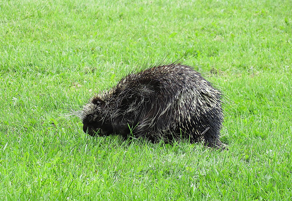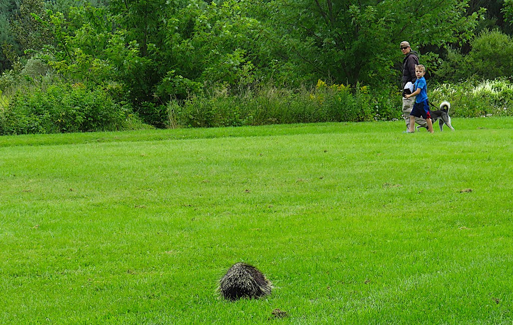 In Grand Valley Park, a father and son are walking their dog, which suddenly starts yapping at something moving in the middle of a lawn area. The porcupine, for so it is, takes absolutely no notice, browsing unperturbed on the grass. Porcupines are short-sighted, but this one certainly sees me as I move in for a close-up. It acknowledges my presence by raising its head one inch for one second. I think it feels so well armoured by its quills that it can afford to ignore just about anything in its vicinity that other wild creatures would immediately view as a threat. Nothing fretful whatever about this porpentine!