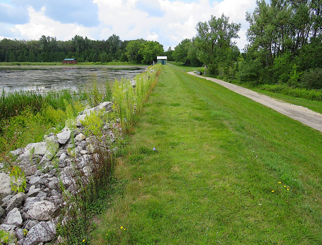 Only in more recent years has the Grand’s cycle of spring flooding and summer drying-up been broken by careful water management, of which the dam here plays an important part. The Grand River Conservation Authority, which oversees the marsh, has its origin in the 1930s. Its mission today is to “work with local communities to reduce flood damage, provide access to outdoor spaces, share information about the natural environment, and make the watershed more resilient to climate change.” As the sign above suggests, Luther Marsh now welcomes bird watchers (263 species spotted), hunters (waterfowl, deer, rabbits), and hikers and cyclists (it’s about 32 km around the lake). Fishing, however, is poor as the lake is shallow and full of aquatic vegetation.