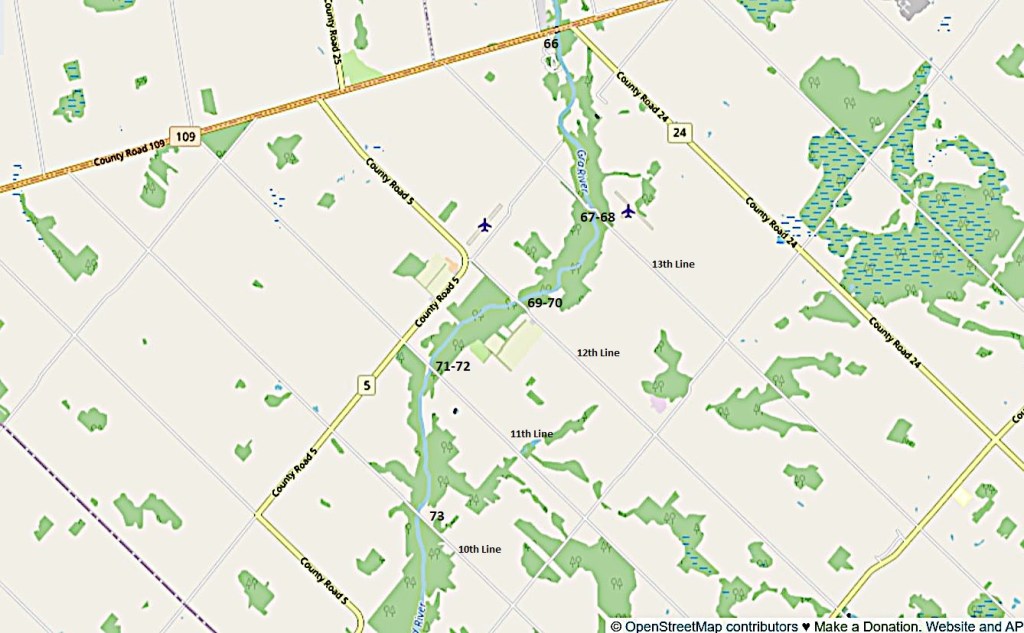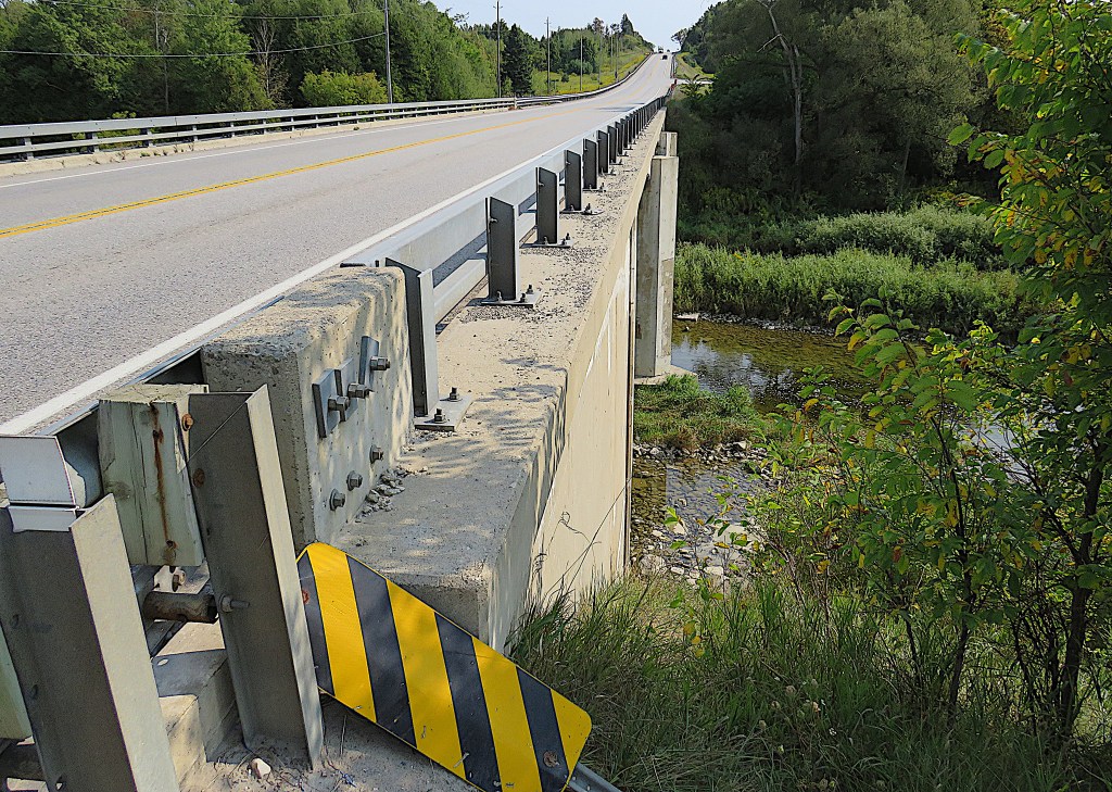 66. The next bridge, carrying busy County Road 109 over the Grand, is not recommended for a stop. Parking is awkward, huge trucks whizz by to and from Orangeville, the view is not worth the risk, and access to the river below is precipitous.