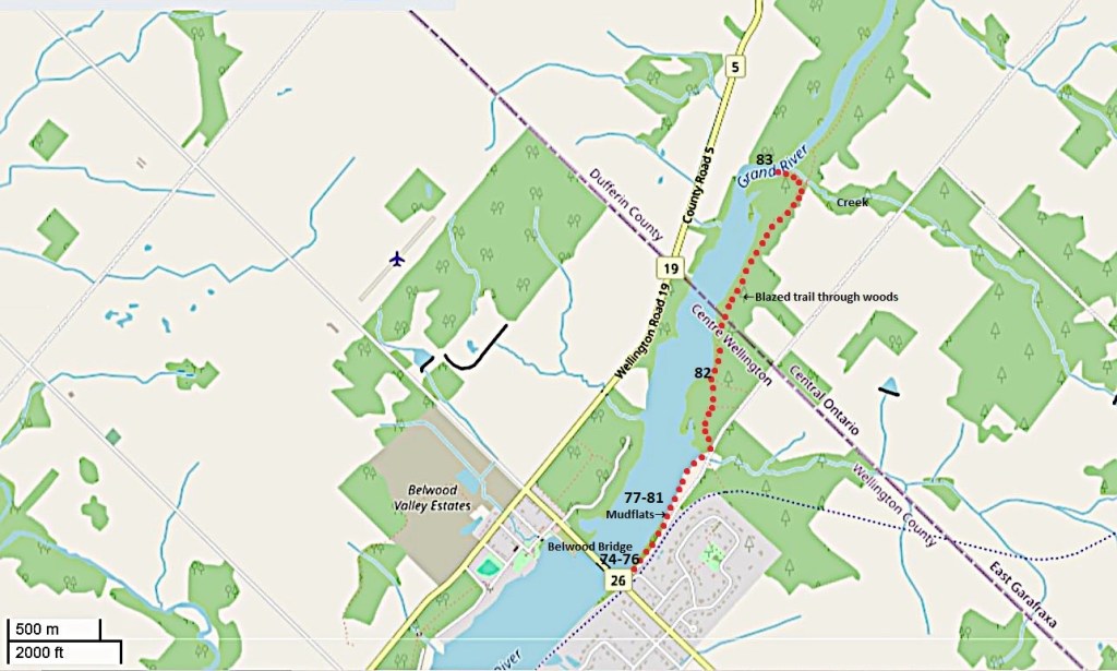 75. From Belwood Bridge looking upriver. There’s a cottage road on the west bank with properties coming right down to the shoreline. But the east bank at right has not been colonized, possibly because it’s more subject to flooding.