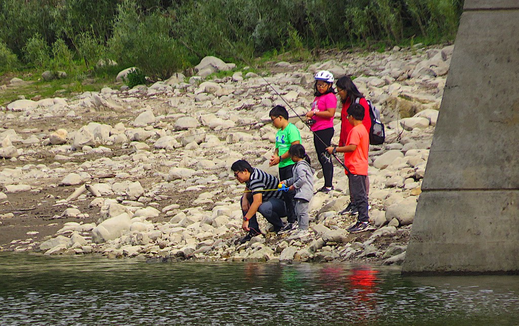 76. Let’s descend to the riverbank behind the southernmost pier of the Belwood Bridge, near where this family is fishing.