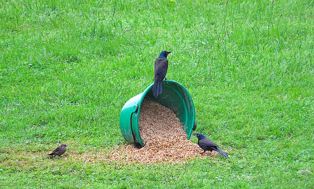 72. Downstream from the 11th Line bridge, there’s a lawn on which a bucket of grain has been artfully spilled as a slightly unconventional bird feeder. One grackle is stuffing itself while the other guards the bucket from interlopers. A sparrow waits patiently for the pair of bullies to clear off.