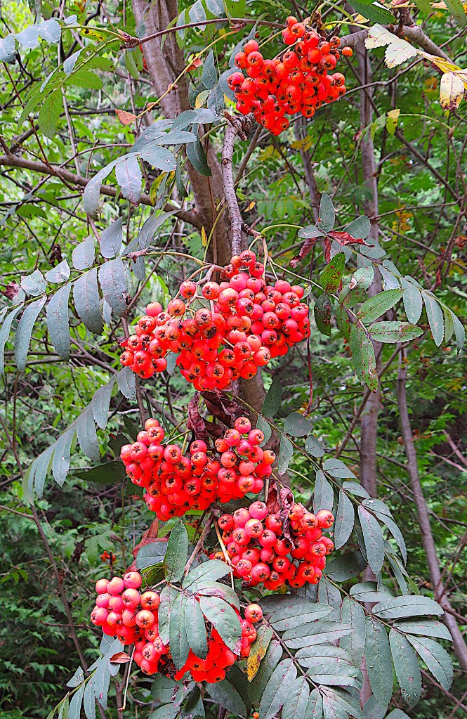 53. By the Trailway, mid-August, a fine crop of rowan berries. Sorbus aucuparia, the rowan or mountain ash, is a northern European tree that has adapted well to temperate North America. Its berries, which are full of sugar, are very popular with songbirds, especially waxwings. Berries left on the tree long enough will ferment, and cold weather will concentrate their alcohol content. Then birds who binge on them become drunk and can be seen falling out of trees, staggering around on the ground, or flying headfirst into windows.