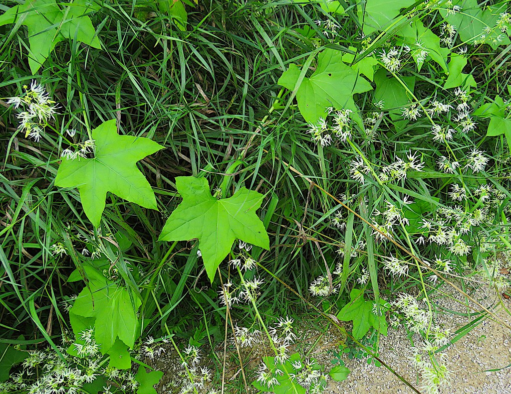 54. Also by the Trailway: wild cucumber (Echinocystis), a North American native. This is a widely distributed vine, related to the domestic cucumber. Its fruit, inedible by humans, is a capsule that looks like a small prickly watermelon.