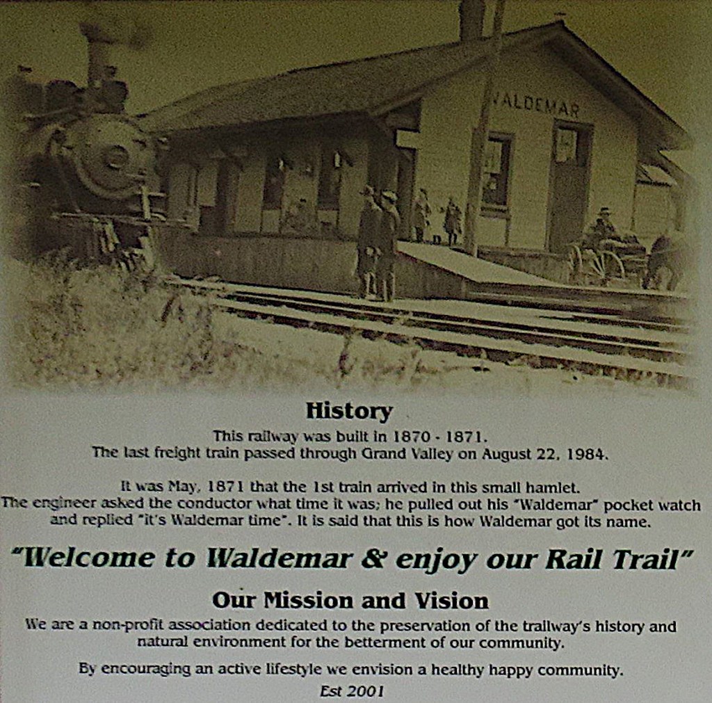 An information board at the eastern terminus of the Upper Grand Trailway explains how “it is said” the hamlet got its name. (“Waldemar” was a popular brand of pocket watch put out by the New York Standard Watch Company in the mid-19th century.) It’s a charming anecdote, though almost certainly untrue as the timing is off: the place was already named Waldemar when its post office was established in January 1870.