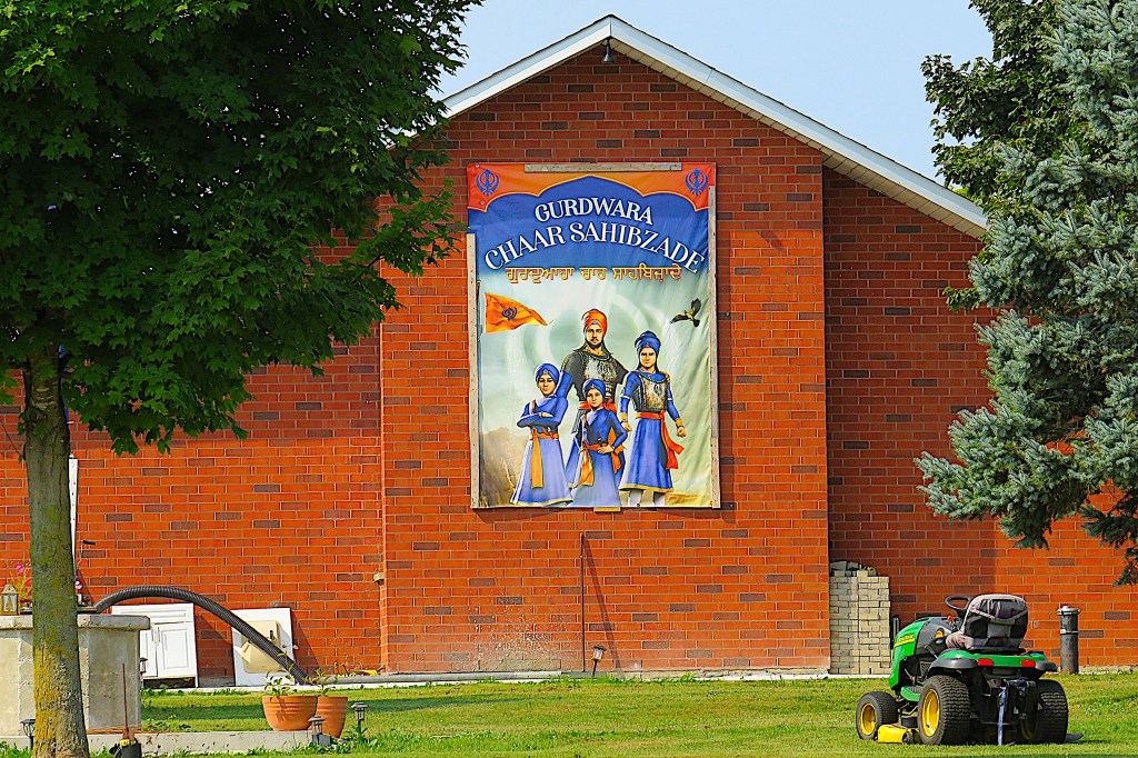 59. An exotic surprise by the Grand on 10th Line just north of Waldemar: a Gurdwara (Sikh Temple) named for the historical events depicted in the popular Punjabi animated film Chaar Sahibzaade (2014). The image on the wall facing the river is a version of the film poster.