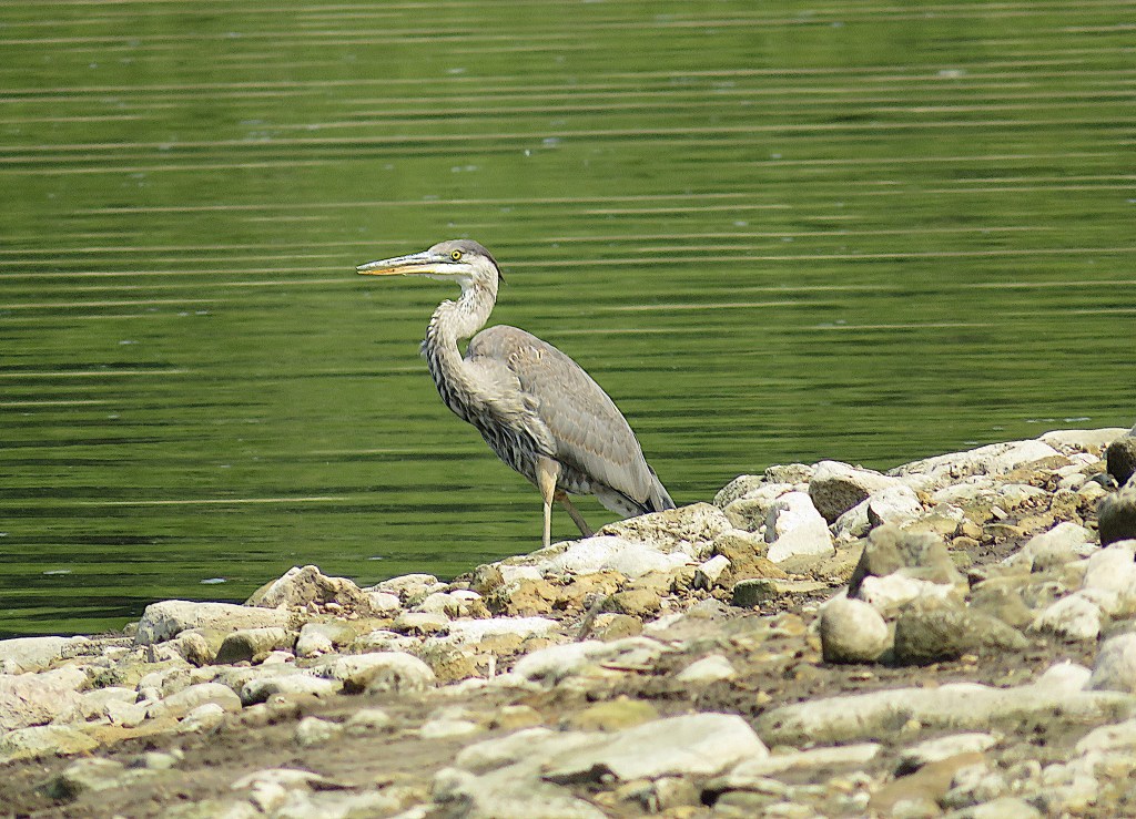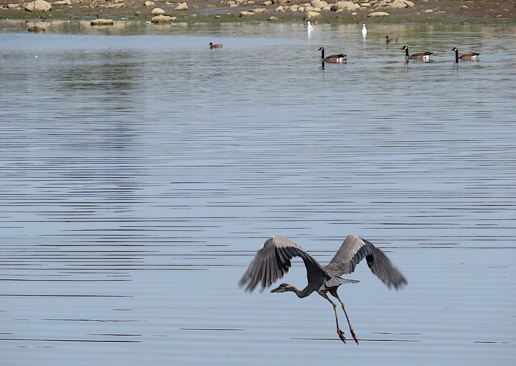 77. For such big birds, great blue herons scare easily. With six-foot wingspan and bent neck, their flight is slow and steady, long legs periodically trailing in the water.