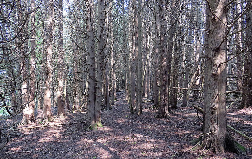 82. After about 1 km, the shoreline meets the start of a trail through the woods. The Grand is just visible at left. The white blazes marking the trail are sometimes poorly defined or missing. Can you spot the one in the image above? This unnamed trail to nowhere in particular is a bit of an adventure and you won’t meet too many people on it … that is, probably no one at all.