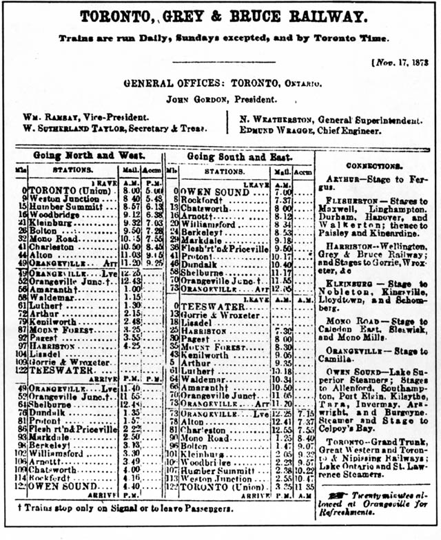 In that year Dundalk, Grand Valley (then called “Luther”), and Waldemar were all connected to Toronto by a train that ran six days a week. You’d leave Waldemar at 10:34 am and arrive at Toronto’s Union Station about 5 hours later, with a 20-minute break at Orangeville “for Refreshments.” As it’s about 100 km to Toronto, the train’s average speed was a little better than 20 km/h.