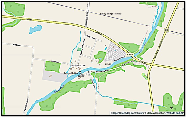 229. The covered bridge naturally attracts lots of tourists. But the riverbanks it sits on are private property and ill-tempered signs make it clear that visitors are not welcome to wander there. Better park your car at the small P at the junction of River’s Edge Drive and Letson Drive, where there are various information boards about the bridge and West Montrose.