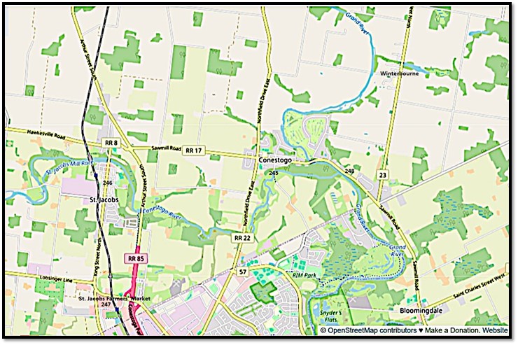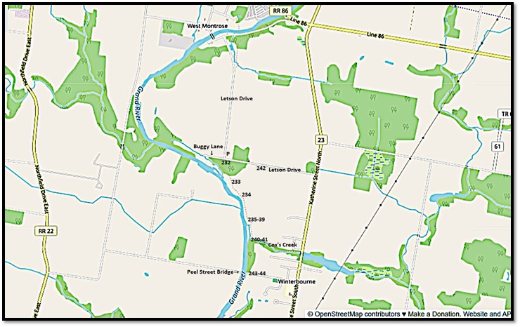 241. … it’s Cox’s Creek, which the trail follows as far as Short Street in the nearby village of Winterbourne. From that point, aside from a short detour into Snyder’s Flats, the GVT, keeping to the east side of the river, uses public roads, unaccountably avoiding the banks of the Grand for the next 14 km. To stay close to the Grand we’ll need to find a trail on the west side that actually follows the river’s course. Once we leave Woolwich Township and enter the City of Waterloo, there is such a trail, as we shall see in part 9.