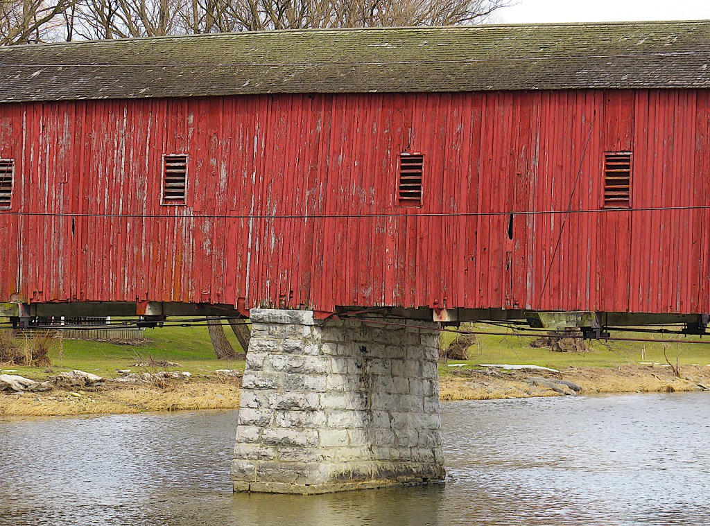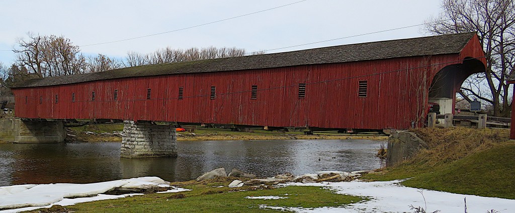 *It’s no longer the only covered wooden bridge in Ontario, however, as a lattice covered pedestrian bridge based on an early 19th century design was built across the Speed River in Guelph in 1992.