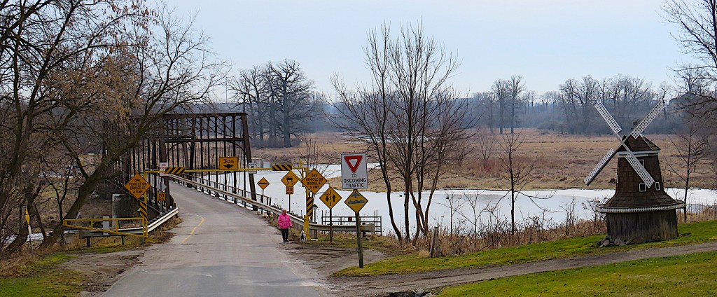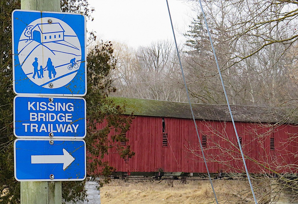 The Kissing Bridge Trailway runs 45 km from Guelph westward to Millbank. It occupies the eastern part of the former CP Rail Line from Guelph to Goderich, abandoned in 1990, and is maintained by volunteers. The Covered Bridge at West Montrose is the highlight of the Trailway, but it’s not actually on the Trailway, which crosses Covered Bridge Drive (Road 62) 1 km north of the bridge. As we have seen (#212 above), hikers on the Trailway have to make a long diversion here, the rail bridge having been demolished when the line was abandoned.