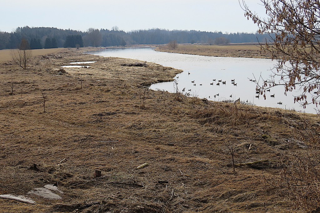 The woman is exercising her dog on the flats across the Grand, but the dog is more interested in those geese than in its owner’s ball …