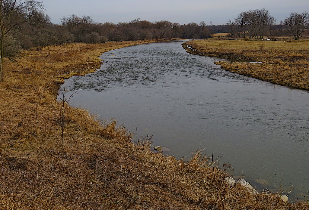 (Bottom) Viewed from the bridge, the Conestogo River flows east to its junction with the Grand about 1.5 km away. Here in the Conestogo’s lowest reach there is little to distinguish the tributary from the main waterway.