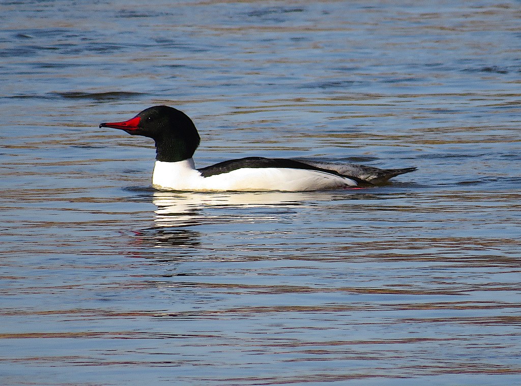 237. A male common merganser on the river. This big duck, a goosander to Europeans, is a diver for small fish in both fresh and salt water. The word “merganser” comes from two Latin words, mergere (to dive, to dip into water) and anser (goose). His long red bill has a serrated edge to help him retain fish. Awkward on land, he’s a superb flier, strong and arrow-like, but the river is wide enough here that he’s not spooked into taking off by my presence or that of my companion.