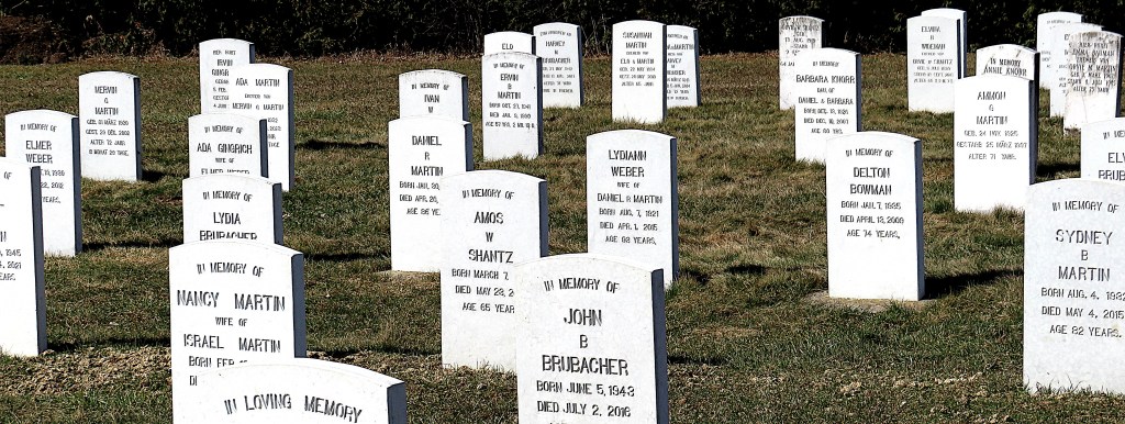 (Bottom) Winterbourne Mennonite Cemetery adjoins the meetinghouse. The gravestones and their messages are as plain as the architecture of the building.