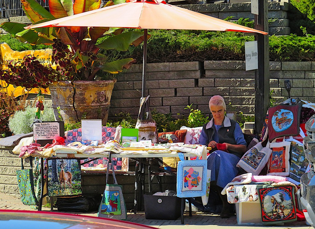 (Middle) An Old Order Mennonite lady sells handicrafts at her sidewalk stall.