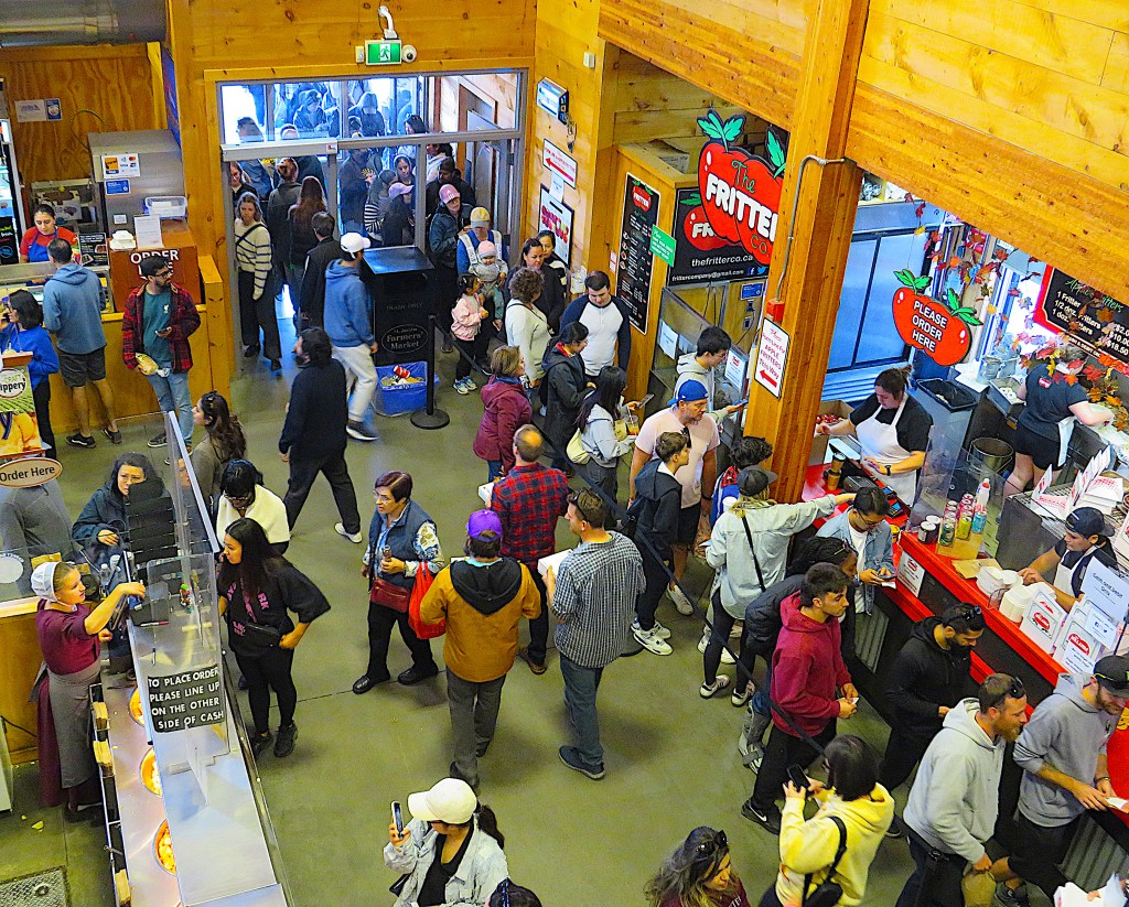 (Bottom) The indoor market is pretty crowded too. The line-up at this apple fritter stand stretches outside and around the block.
