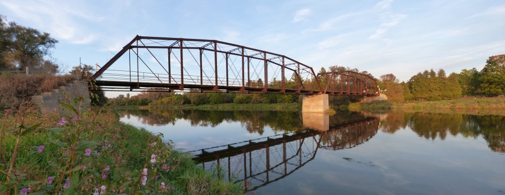218. We’re on River’s Edge Drive on the south bank of the Grand River approaching the village of West Montrose (pop. 245). Ahead is the most iconic – that overused word is apt here – of the hundreds of bridges across the Grand and its tributaries.