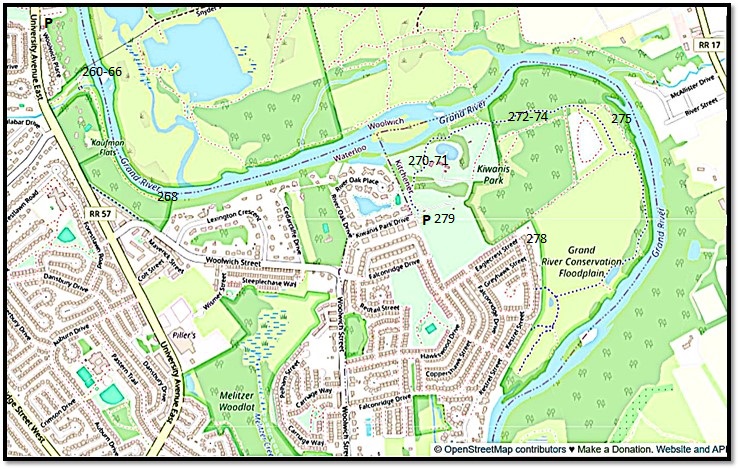 Map 23. Snyder’s Flats Conservation Area occupies the inner, Woolwich side of the oxbow. It’s definitely worth visiting for a hike at any time of the year, as it has an open, rural feel quite unlike the rapidly urbanizing left bank of the river. To get there, take Sawmill Road to the village of Bloomingdale, then go west along rough-surfaced no-exit Snyder’s Flats Road. There’s a small free P at the end of this road. There are many trails in this Conservation Area, the main ones indicated by small red dots on the map. Only the trails on the northeast and southern sides of the Flats allow good views of the Grand itself. Note: as there are no bridges over the Grand in the vicinity, it’s a 10 km drive from Kiwanis Park to Snyder’s Flats, even though it’s barely 1 km as the crow flies.