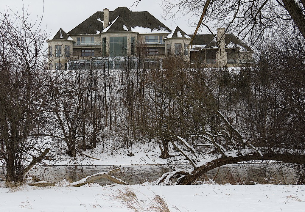 256. This McMansion occupies the bank on our side of the river, throwing the Trail briefly onto Grand River Drive, a public road boasting a cornucopia of McMansions. The back garden protected by this see-through fence along the Trail hardly offers monastic seclusion … but as we have seen, in the McMansion universe, ostentation trumps privacy.