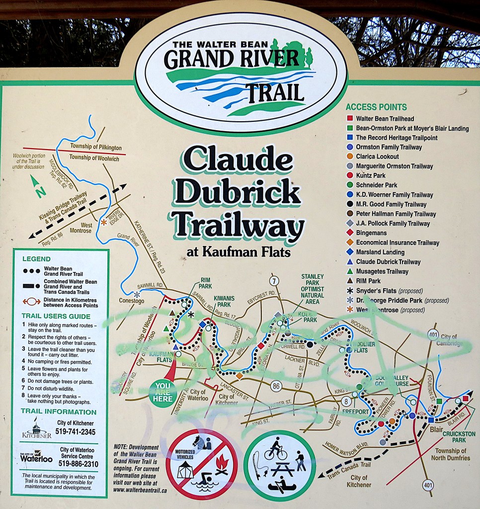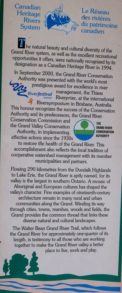 249. For those of us following the Grand as closely as possible, there’s good news: on the left bank the Walter Bean Grand River Trail (WBGRT) begins. It’s a 76 km multi-use trail that traces our river’s sinuous course through the three cities.