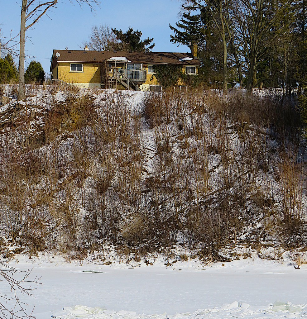 There’s no doubt that the house above is large and ostentatious. The owners evidently want to look out over their domain, as they have removed all the vegetation on their level. Likewise they want their property to be seen and admired, not only by walkers along this trail but also (in season) by golfers on the upscale Grey Silo course on this side of the river.
