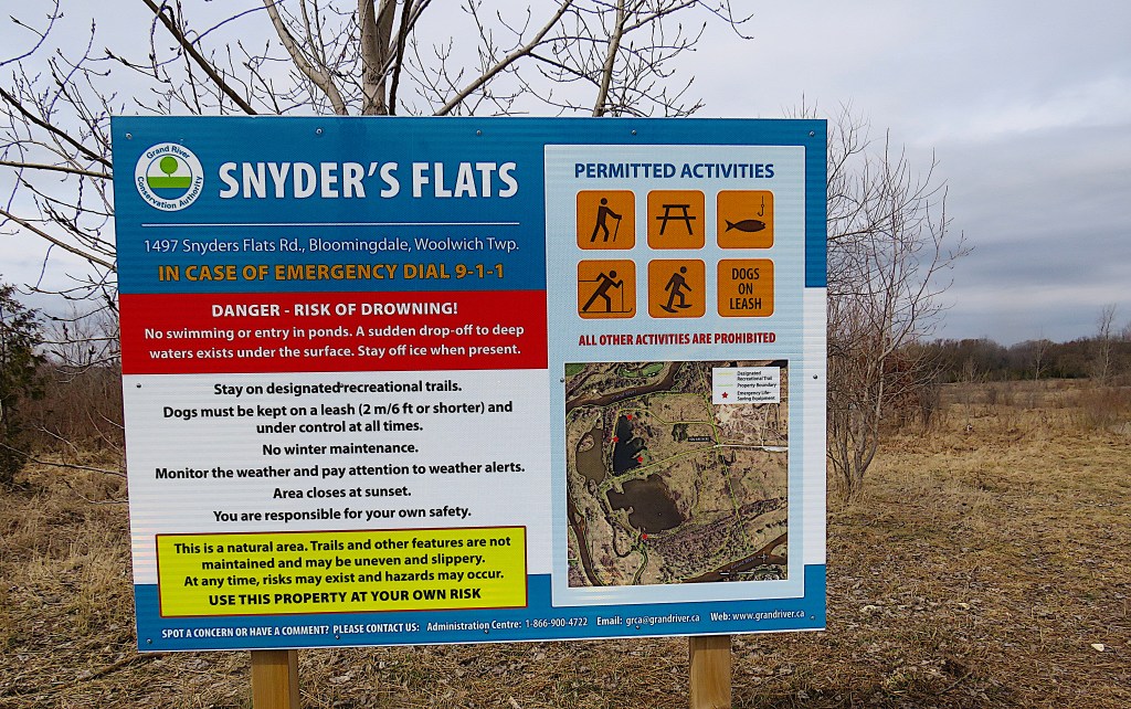 The WBGRT is owned jointly by K-W-C. As a work in progress the Trail can sometimes be a little frustrating for hikers. Some sections are incomplete, others are closed as they are under repair from flooding. Moreover, there’s nowhere to park at its northern end! You have to leave your car at the RIM Park P and hike the first few km of the Trail south to north, then return the same way. (See #259 below for why a loop hike isn’t recommended.) Yet regardless of its flaws, the WBGRT is an excellent resource for hikers and lovers of the Grand River at every time of year.