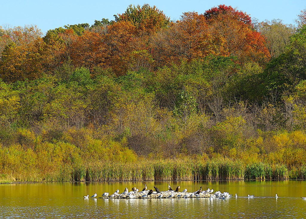 287. Fast forward to October. Cormorants and gulls share that little island on one of the ponds. As these ponds occupy a floodplain, the Grand periodically overflows into them, restocking them with fish.