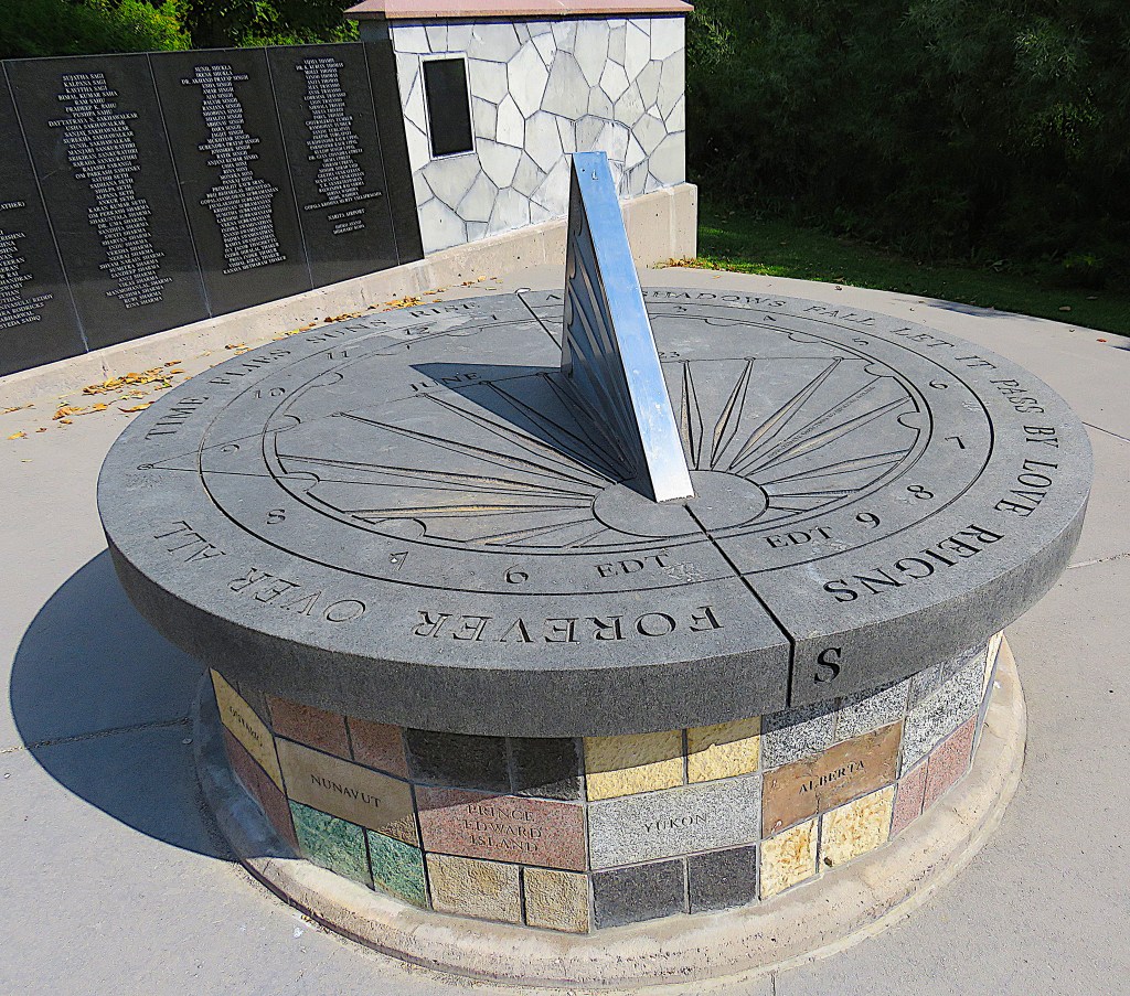 43. The Memorial’s sundial is on a base constructed from stone from each Canadian province and territory as well as from four other countries most directly affected by the bombing. The gnomon – the part of the sundial that casts a shadow – is oriented toward the site of the bombing, near Ireland. Around the edge reads: “TIME FLIES / SUNS RISE AND SHADOWS FALL / LET IT PASS BY / LOVE REIGNS FOREVER OVER ALL”. The Flight 182 Memorial was dedicated in 2007, on the 22th anniversary of the bombing.