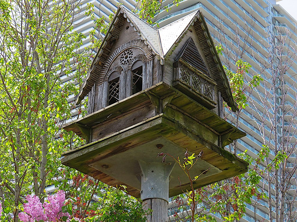 51. The Butterfly Garden at lilac time doesn’t seem to be hosting many butterflies. This elaborate birdhouse at its centre forms an interesting contrast to the rather brutal backdrop.