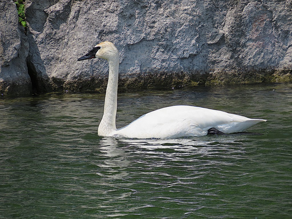 39. They are trumpeter swans, the largest native North American bird. They average 1.5 m in length and have a wingspan of up to 3 m. Adults weigh up to 30 lbs, making them one of the world’s heaviest flying birds. Once seriously endangered, their numbers have recovered and they can now be found quite often on the lakeshore of the Golden Horseshoe, even overwintering here. Their black bills and greater size distinguish them from orange-billed mute swans, an introduced species.