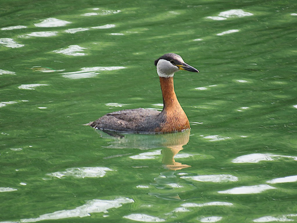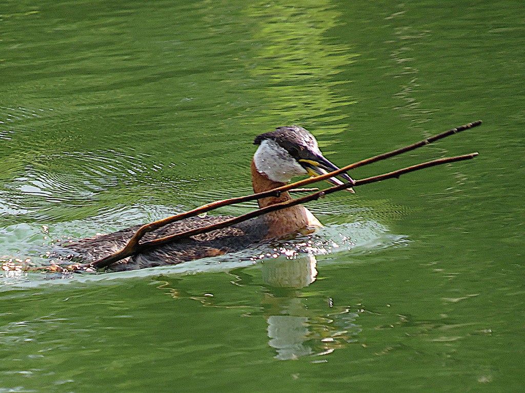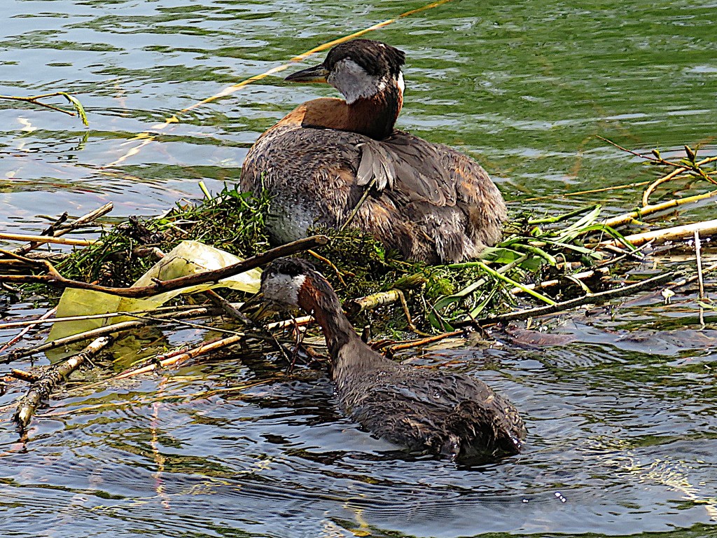 40. Red-necked grebes also like the stormwater ponds, as they are a good shallow place to build their floating nests. In fact this one is busy adding twigs to the nest on which his mate is sitting in brood.