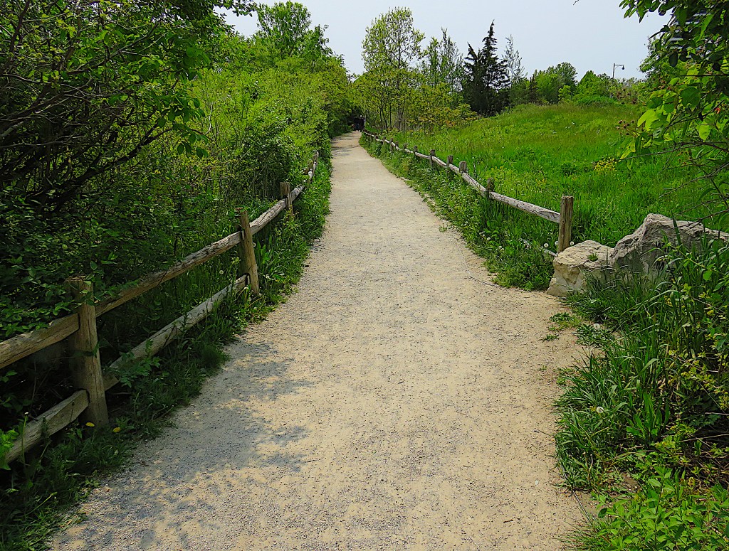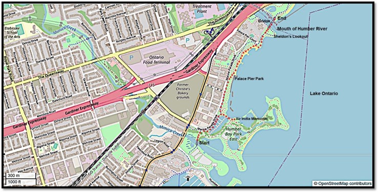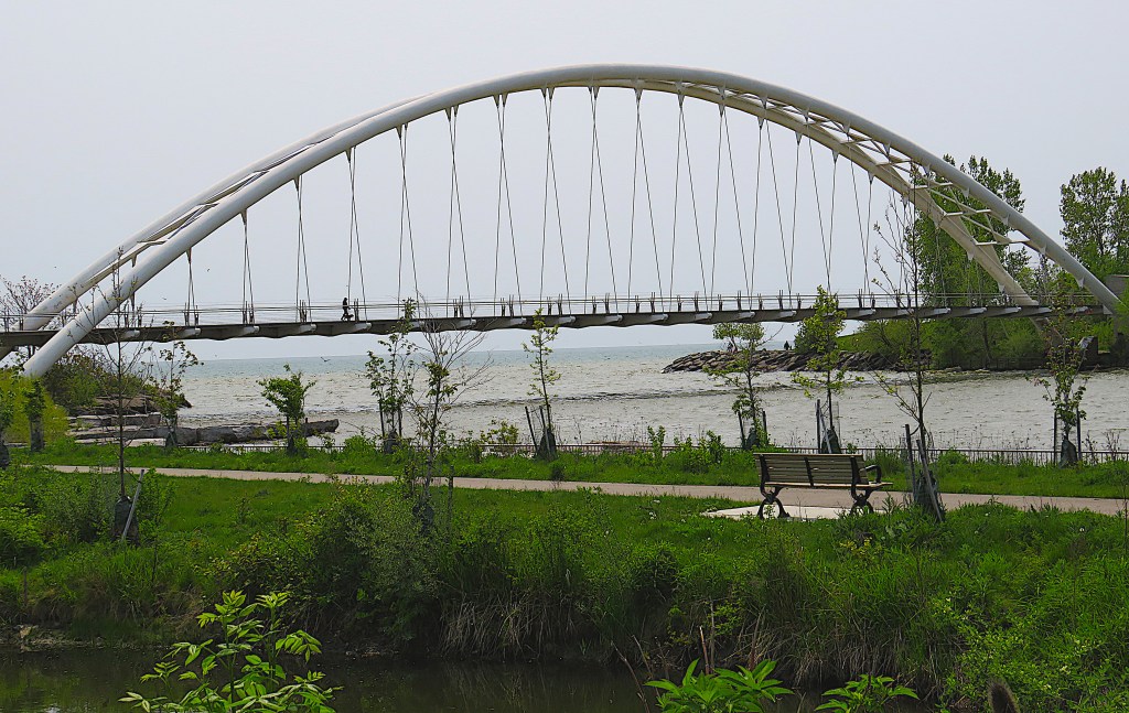 32. Today’s hike, marked as usual with red dots on the map above, is about 1.5 km, or 2 km if you make a side trip to the Air India Memorial. It goes from the north side of the Mimico Creek Pedestrian Bridge to the northeast side of the Humber Bay Arch Bridge. As there is a network of paths along the lakeshore and around Humber Bay Park East, it’s easy to extend the hike by a couple of km and do a loop. If you arrive by streetcar or bus, your best stop is Lake Shore Boulevard West at Park Lawn Road, from where it’s a very short walk to the Waterfront Trail. If you come by car, you’ll park at the large P at Humber Bay Park West (see Part 1).