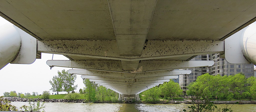 59. The Humber Bay Arch Bridge, intended for pedestrians and cyclists, is 139 metres in length, spanning the 100 metre width of the Humber River only a few metres from its mouth. This striking bridge was designed by Toronto architects Montgomery Sisam and constructed in 1994. Here it’s viewed from the eastern bank of the Humber River looking towards Lake Ontario.