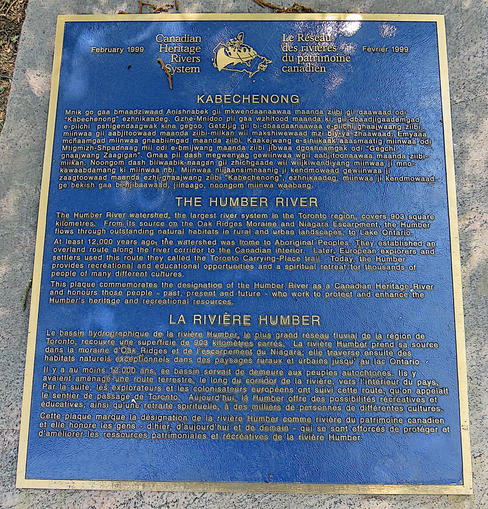 The Humber River was known as Kabechenong in Anishinaabemowin (Ojibwe), the language of the Mississauga, the dominant Anishinaabe First Nation in this area when European settlement began. In the late seventeenth century the Mississauga built a seasonal village on the west bank of the Humber which lasted for more than a century. It was well positioned at the southern terminus of an ancient, major First Nations portage route connecting Lake Ontario, the twin Lakes Simcoe and Couchiching, and Lake Huron. In other words, it was at one end of a short cut between two of the Great Lakes.